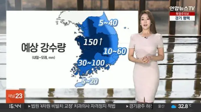 (15일)는 중국 산둥반도에서 북한 방향으로 정체전선이 활성화되어 점차 남하하겠다. (15일) 밤 수도권과 강원영서부터 시작하여 (16일) 대구, 경북은 정체전선의 영향을 받겠습니다.