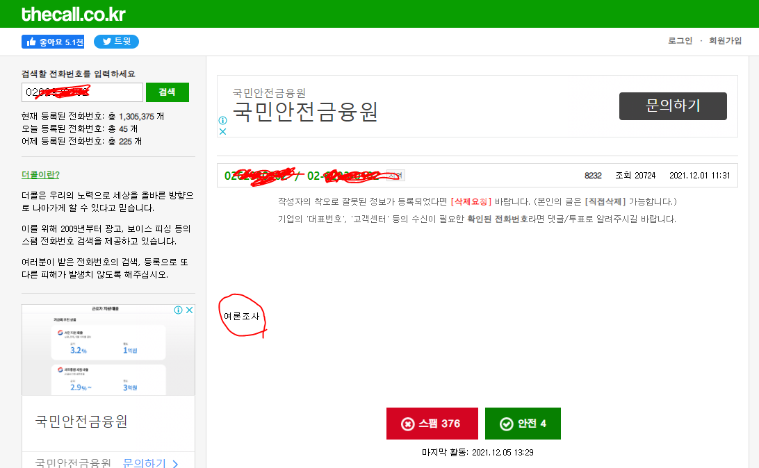모르는 전화번호 검색하는 두 번째 방법은 더콜 사이트를 이용하는 것입니다. 검색 결과 여론조사를 하는 곳의 전화번호였는데 스팸 처리했네요. 전화로 여론 조사하는데 좀 기분 나쁘죠. 어떻게 내 전화번호를 알고 전화하는지 알 수가 없습니다. 개인정보유출인가라는 생각도 들기도 합니다.