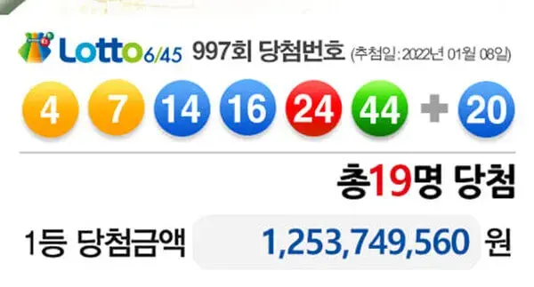 제997회 동행복권 로또 추첨 결과 " 16, 7, 4, 44, 24, 14 "가 1등 당첨번호로 결정됐다. 2등 보너스 번호는 ‘ 20 ’입니다.