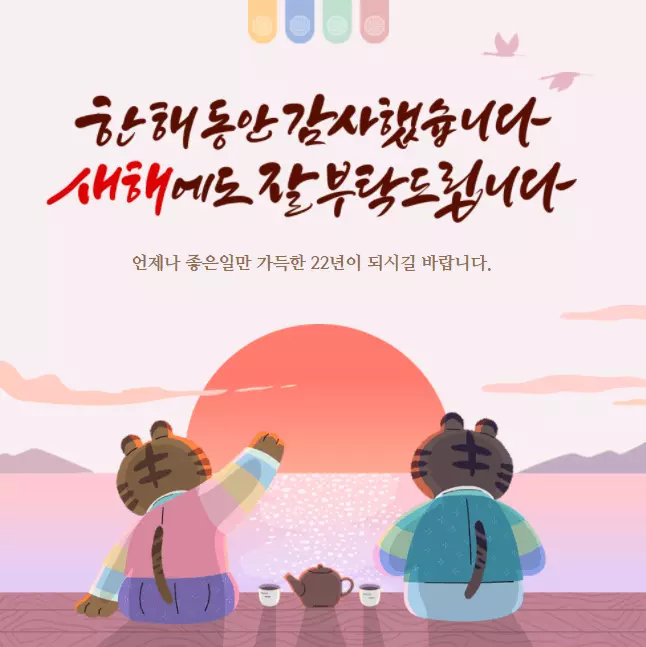 ● 올 한 해 고생 많으셨습니다. 좋은 일도 많았지만 힘들었던 일, 속상했던 일들 모두 잊으시고, 2022년 임인년에는 호랑이 기운 넘쳐 소망하는 모든 일들이 다 이루시길 바랍니다.