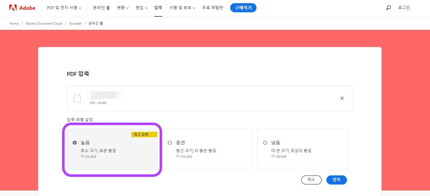 2단계: 파일을 선택하면 화면이 바뀌면서 아래와 같이 기본적으로 "최고 압축"이 선택되어 있습니다. 우측 아래 "압축"을 클릭합니다.