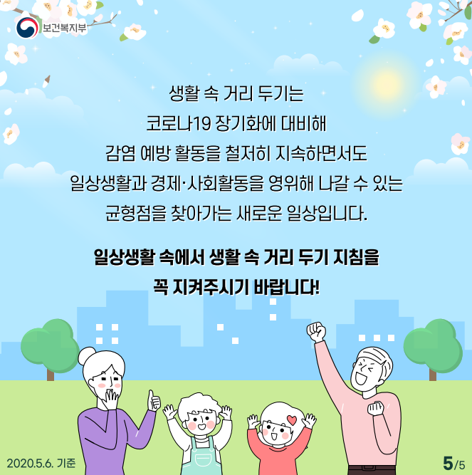 생활 방역체계 네 번째, 코로나 바이러스는 많은 분들이 이젠 아시겠지만 비말을 통해 전파됩니다. 그렇기 때문에 마스크를 꼭 써야 한다고 합니다. 오히려 이로인해 감기증상환자가 없다시피 하는데요. 사람과 사람 사이에 거리를 2m 이상 거리를 두는 경우 침방울이 튀는 위험이 현저하게 줄어드니 대화를 할 때는 더욱 조심스럽게 얘기하는 것이 매우 중요합니다.